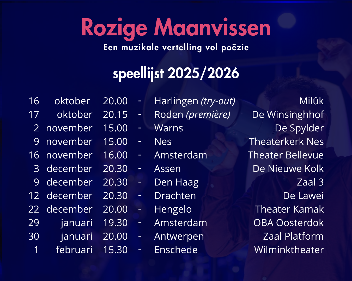 Er zijn twee nieuwe speelplekken bij gekomen! Tijdens de Poëzieweek 2026 spelen we nu ook in OBA, Amsterdam (29 jan) en op 22 december spelen we in Hengelooooo (Theater Kamak).
