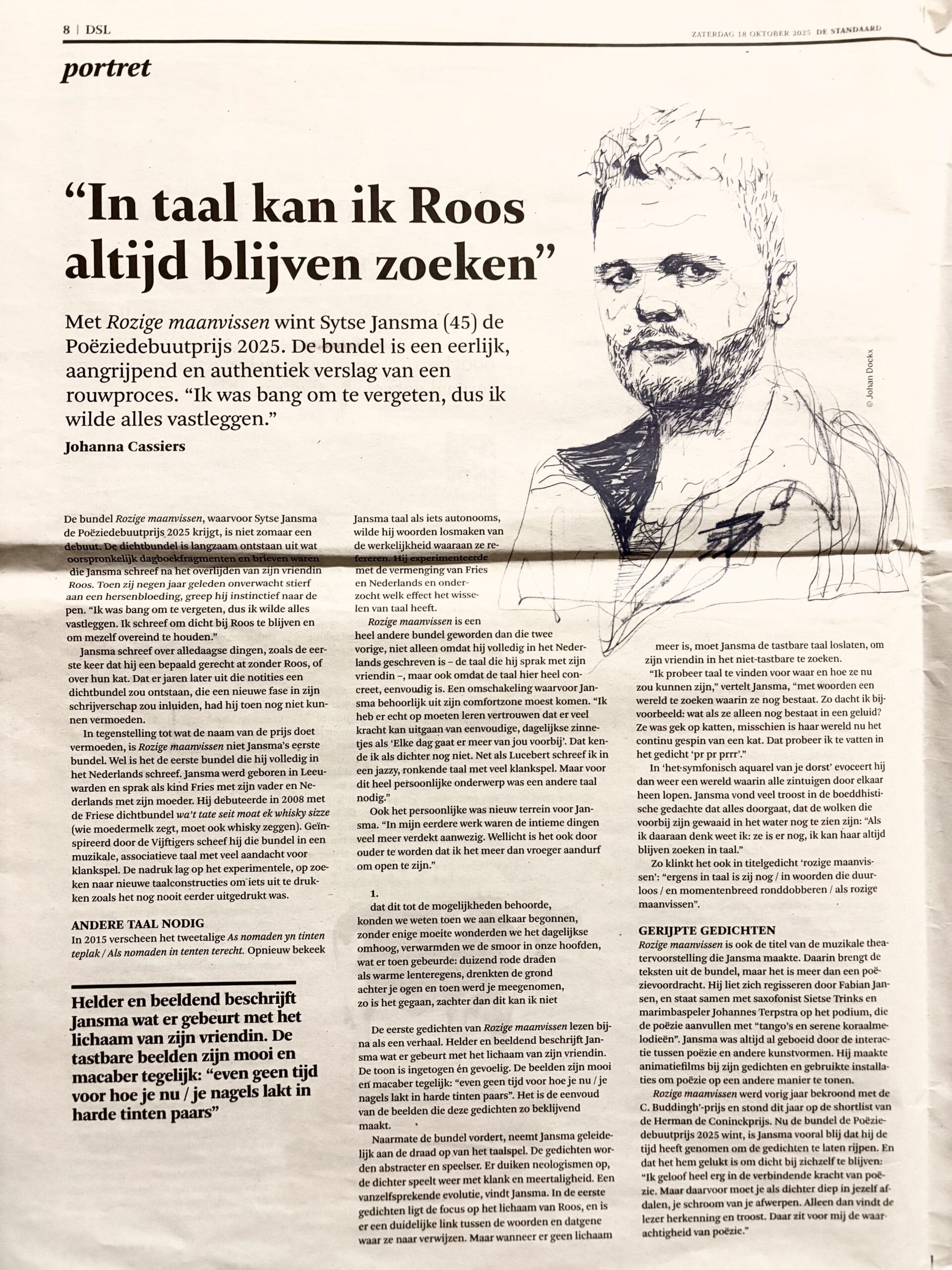 Cassiers, Johanna. (De Standaard der Letteren 18 okt 2025) ”In taal kan ik haar altijd blijven zoeken’ SDL, pag 8