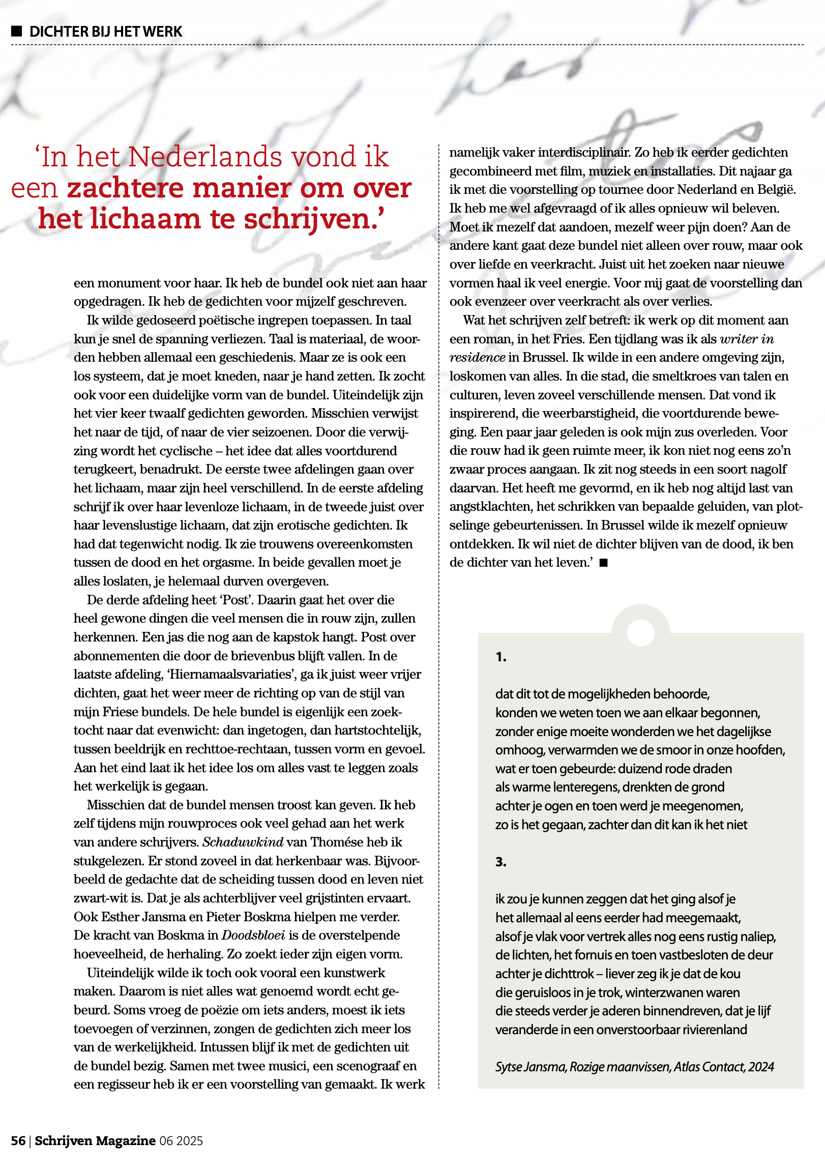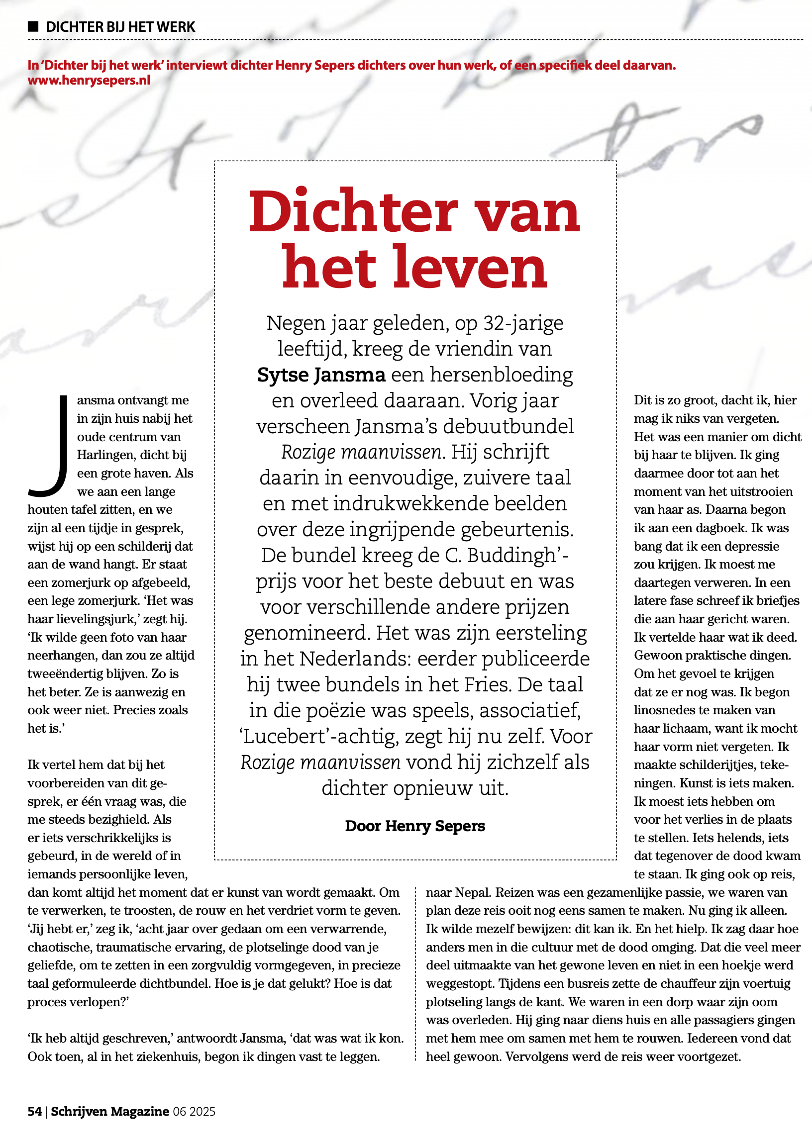 Sepers, Henry. (Schrijven Magazine 06 2025) Dichter van het leven. Schrijven Magazine, pag 54-56