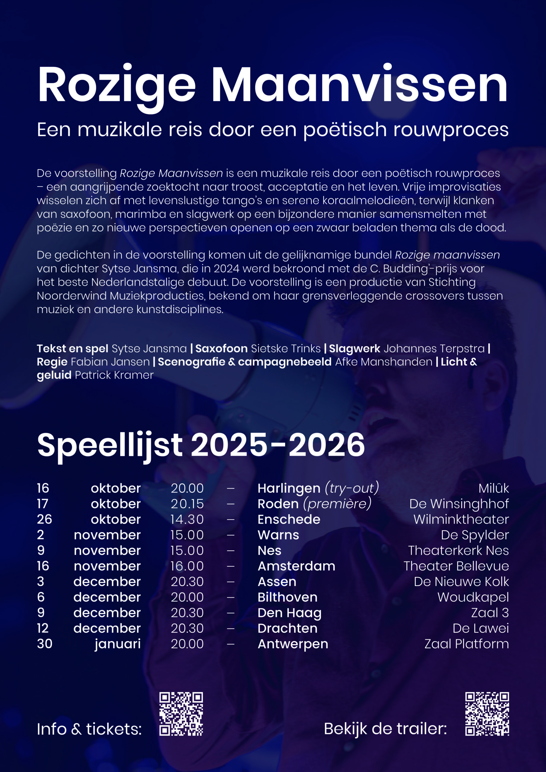 Kom je ons bezoeken? Van oktober t/m januari toeren wij door Nederland en België met onze theatervoorstelling Rozige Maanvissen.